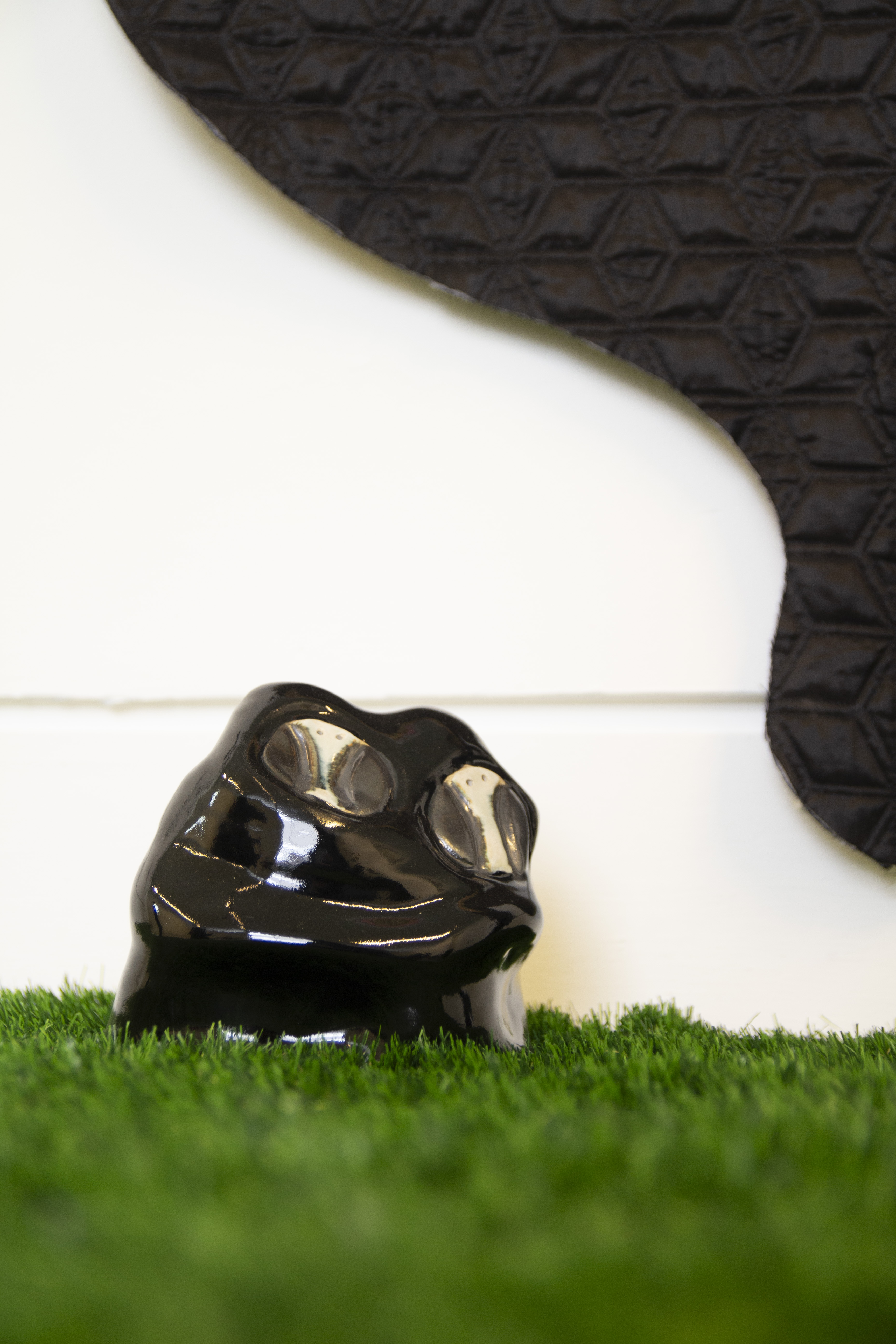 ‘Everything Is Satisfactual is a deconstruction of toy culture, specifically, the history of the black representation within kitsch consumption and the masking of racist propaganda under the guise of cuteness. Barnes unravels how the consumption of cuteness perpetuates and upholds forms of oppression and marginalisation specifically but not limited to racialisation, infantilism, misogyny and brutality. The sinister subliminal message underneath the soft, squishy surface of seemingly ‘innocent’ objects is explored through an Afro-surreal retelling of the Br’er Rabbit and the Tar Baby folktale, which her enslaved ancestors developed after being ripped from Africa. The installation plays with the appropriative natures of surrealism and pop art to make the ‘toys’ and the folktale come to life and expose what lies beyond the sugary sweet surface of cute things.